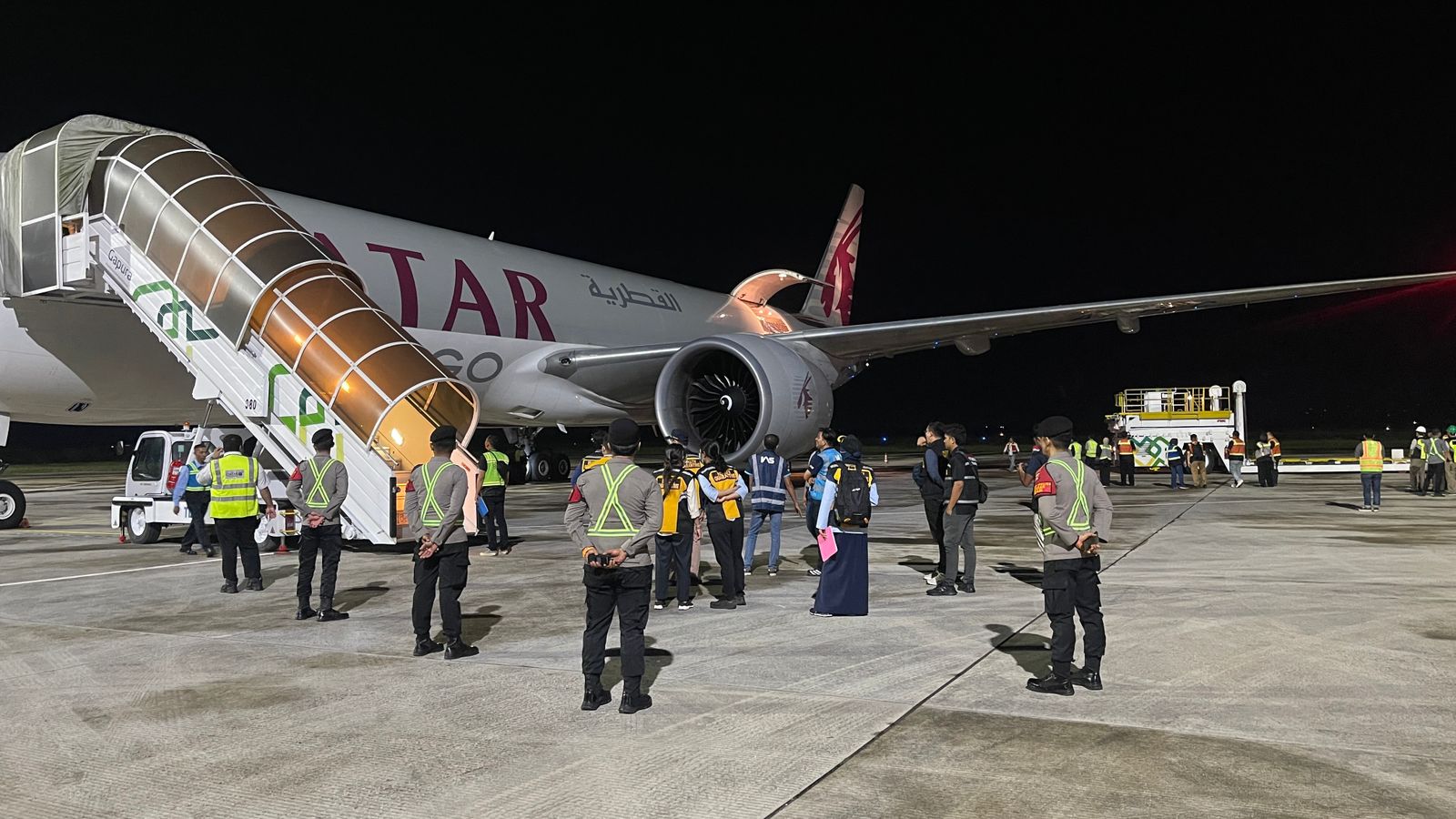 ‎Sementara itu itu untuk logistik tahap II tiba Dini Hari pukul 00.30 Wita menggunakan Pesawat kargo kedua, Qatar Airways QTR 8356 (rute NRT-LOP), mendarat di BIZAM.