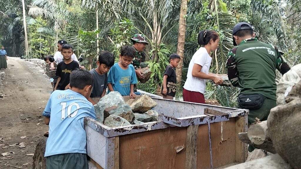 Lombok Barat, NTB – Suasana siang di Dusun Sayang, Desa Giri Madia, Kecamatan Lingsar, Lombok Barat, tampak berbeda. Beberapa anak terlihat antusias menurunkan batu dari traktor modifikasi didampingi orang tuanya. Mereka dengan penuh semangat ikut membantu anggota Satuan Tugas (Satgas) TNI Manunggal Membangun Desa (TMMD) ke-126 Komando Distrik Militer (Kodim) 1606/Mataram yang tengah melakukan pengerjaan penaludan dan membuka akses jalan penghubung di desa mereka, Kamis (16/10/2025).