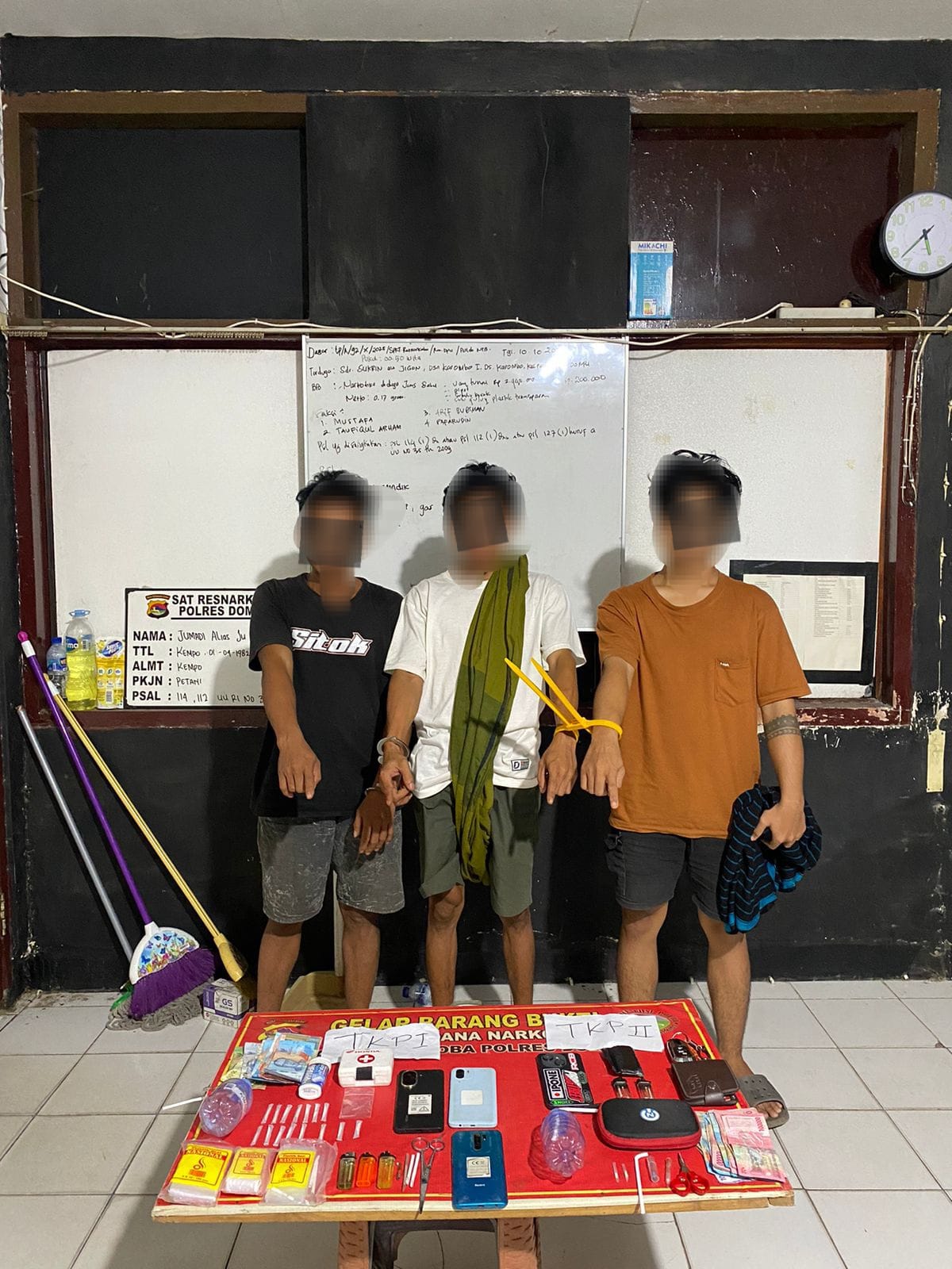 TIGA TERDUGA PELAKU PENGEDAR SABU DIAMANKAN TIM GABUNGAN POLSEK PEKAT DAN SATRESNARKOBA POLRES DOMPU