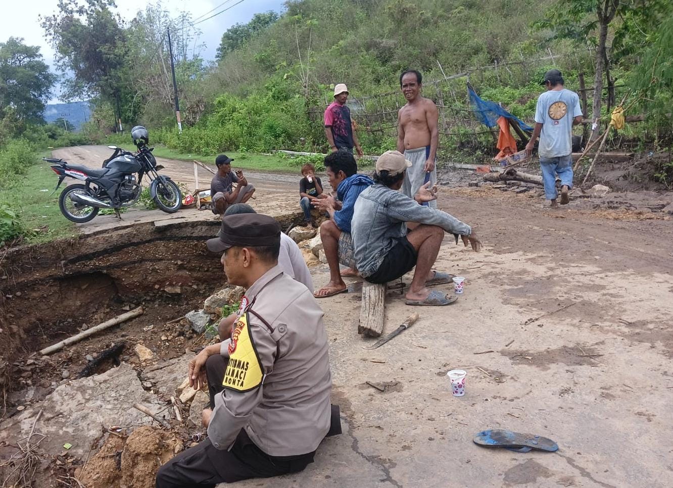 Longsor, Jalan Lintas Tente-Langgudu Terputus, Bhabinkamtibmas Polsek Monta dan Warga Buat Jalan Alternatif dan Bantu Para Pengendara