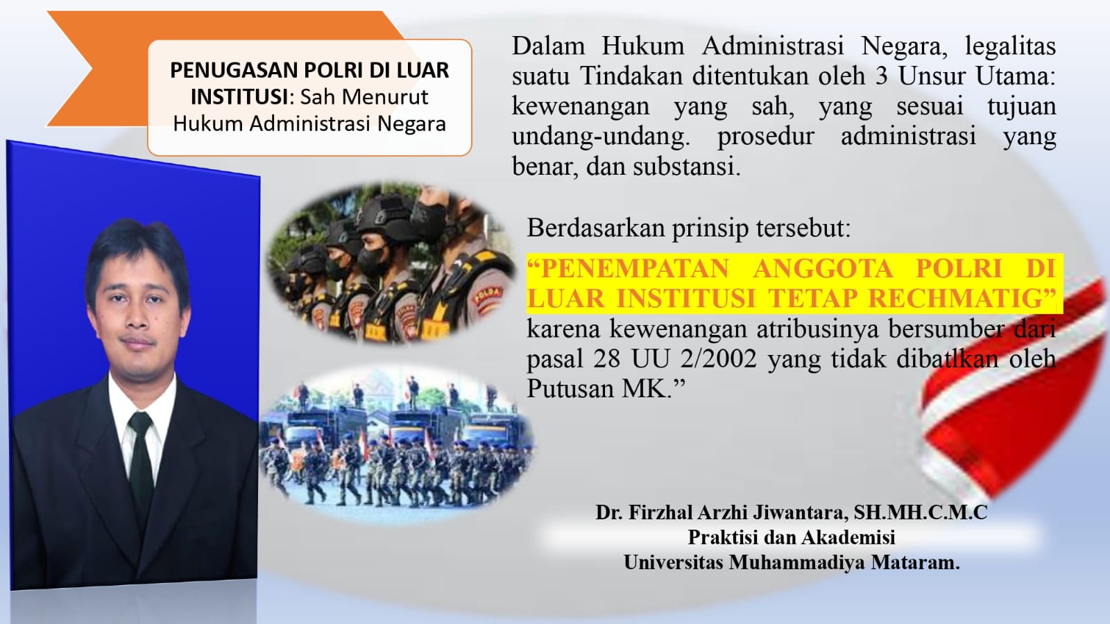 “Dalam Hukum Administrasi Negara, legalitas suatu tindakan pemerintahan ditentukan oleh tiga unsur utama: kewenangan yang sah, prosedur administratif yang benar, dan substansi yang sesuai tujuan undang-undang. Berdasarkan prinsip tersebut, penempatan anggota Polri di luar institusi tetap rechtmatig, karena kewenangan atribusinya bersumber dari Pasal 28 UU 2/2002 yang tidak dibatalkan oleh Putusan MK.”