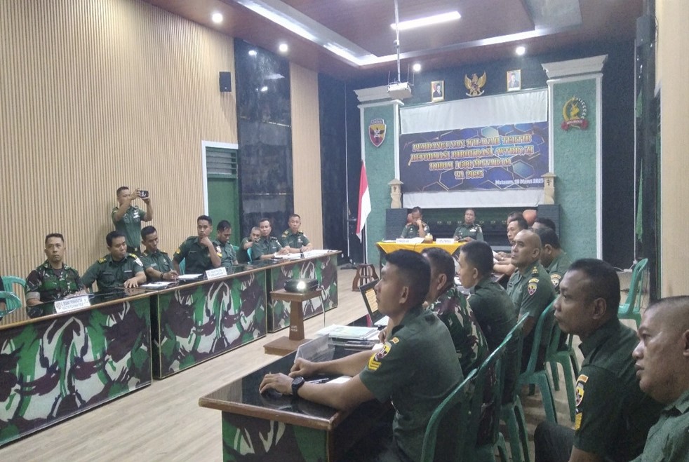 Mataram, NTB – Komando Distrik Militer (Kodim) 1606/Mataram kembali menegaskan komitmennya dalam membangun tata kelola organisasi yang bersih, transparan, dan berintegritas. Komitmen tersebut diwujudkan melalui pelaksanaan Evaluasi Tim Kelompok Kerja (Pokja) Pembangunan Wilayah Tertib Reformasi Birokrasi (WTRB) yang dipimpin langsung oleh Komandan Kodim 1606/Mataram, Kolonel Arm Muh. Saifudin Khoiruzzamani., S.Sos., M.Han., di Aula Kodim 1606/Mataram, Jl.Pejanggik No.7, Kota Mataram, Nusa Tenggara Barat, Selasa (18/3/2025).