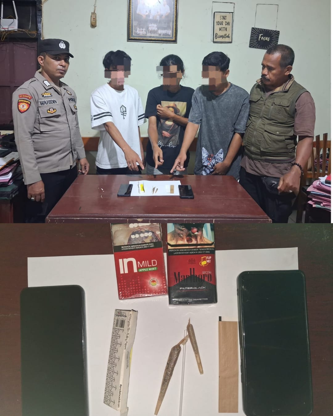 Hasilnya petugas berhasil menyita barang bukti 1 linting setengah ganja yang sudah dicampur dengan tembakau Malboro Bolong,( 1 Kertas Paping)