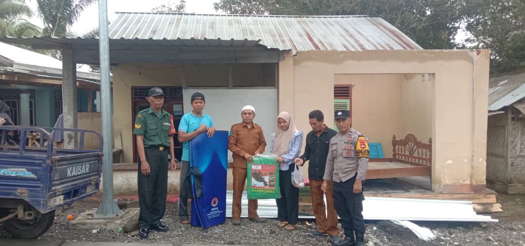 Bantuan tersebut diberikan kepada Saefudin Hafis, warga yang rumahnya mengalami kerusakan akibat atap tertiup angin kencang yang melanda wilayah tersebut pada pekan lalu. Kehadiran Babinsa dalam kegiatan ini bertujuan memastikan penyaluran bantuan berjalan aman, lancar, serta tepat sasaran.
