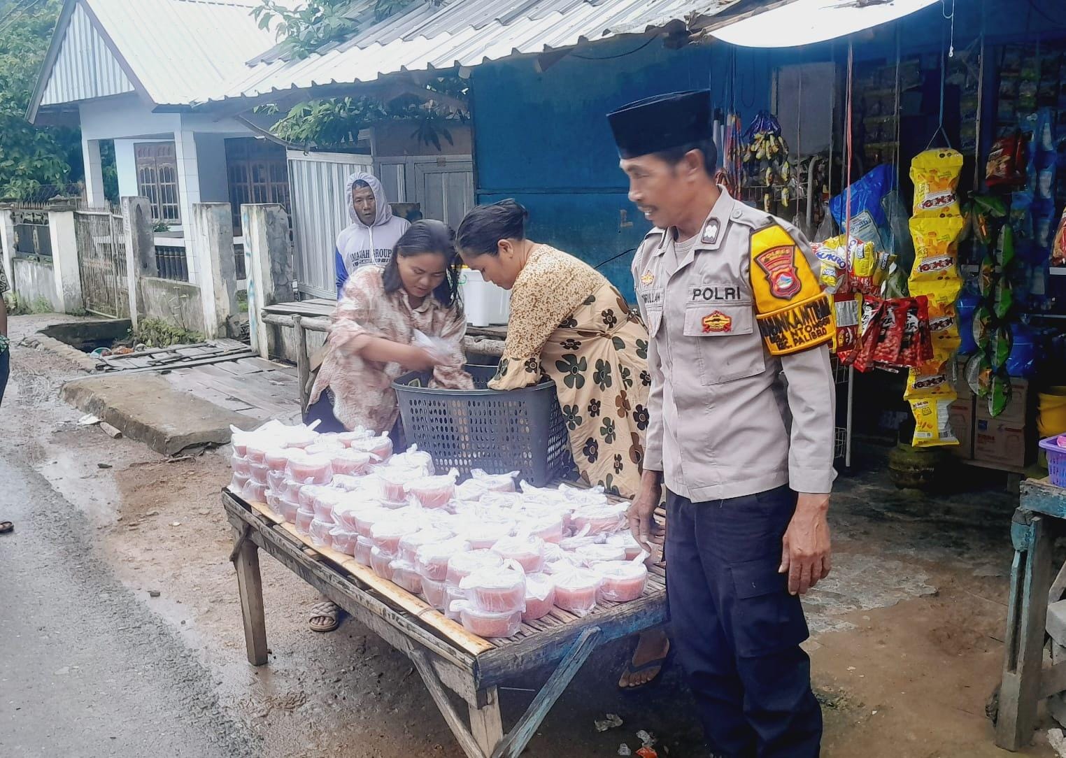 Bripka M.Amirullah anggota Polsubsektor Palibelo Polres Bima Kabupaten Polda NTB didampingi oleh sang isteri membagikan puluhan paket takjil berbuka puasa.