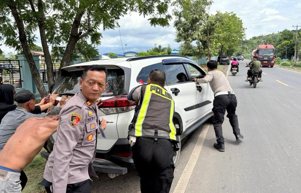 Di tengah padatnya arus lalu lintas, anggota Pos Pelayanan (Pos Yan) Polres Bima Kabupaten Polda NTB, menunjukkan aksi cepat tanggap dengan membantu mengevakuasi sebuah kendaraan roda empat yang mengalami mogok di tengah jalan, Minggu (22/3/2026).