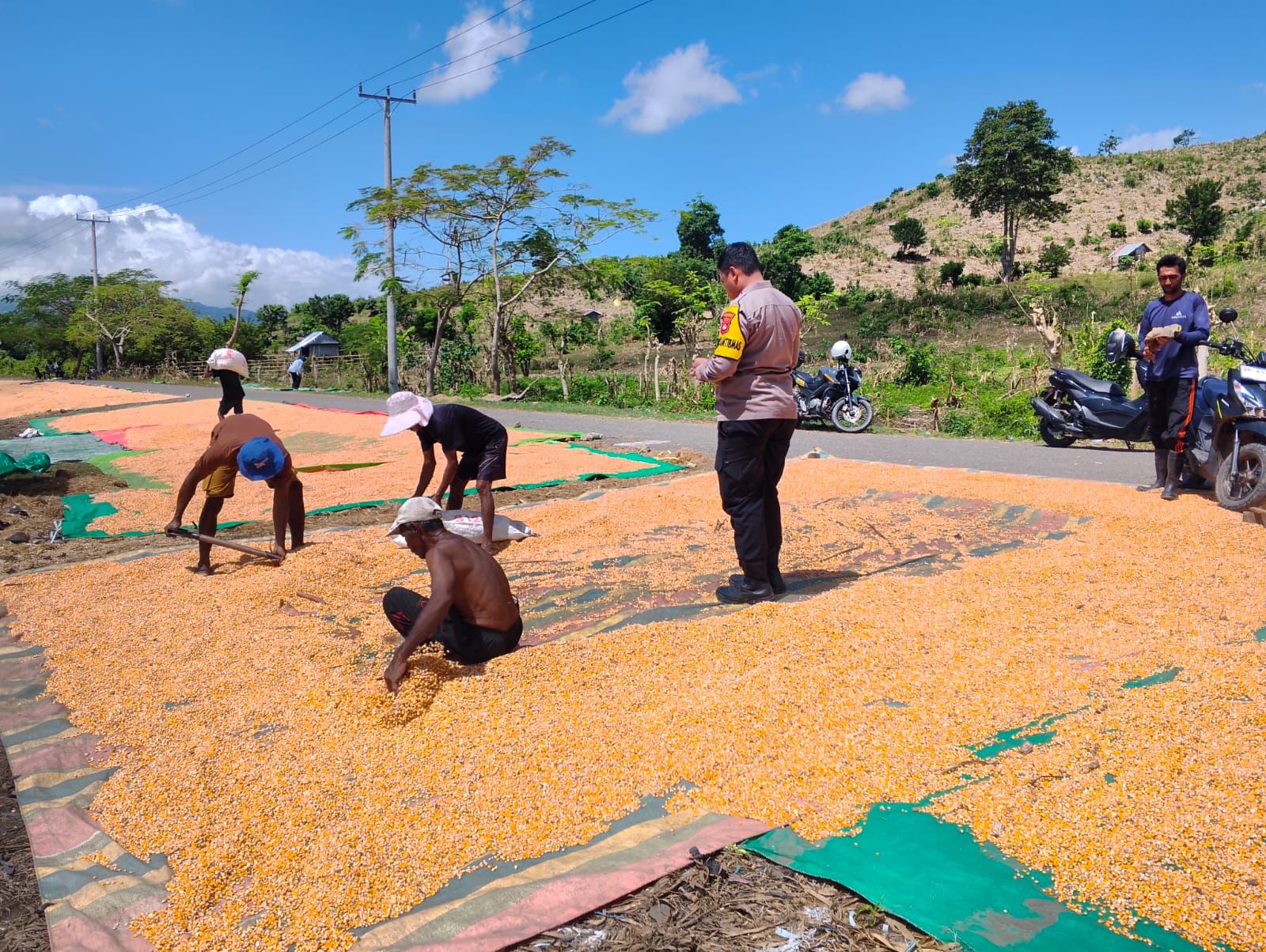 Dalam rangka mendukung Program Ketahanan Pangan Nasional menuju Indonesia Emas, Bhabinkamtibmas Desa Bara, Kecamatan Woja, Kabupaten Dompu, BRIPKA Supriadin melaksanakan kegiatan pemantauan penjemuran jagung milik warga binaannya pada Senin (13/04/2026) pukul 11.00 WITA hingga selesai.