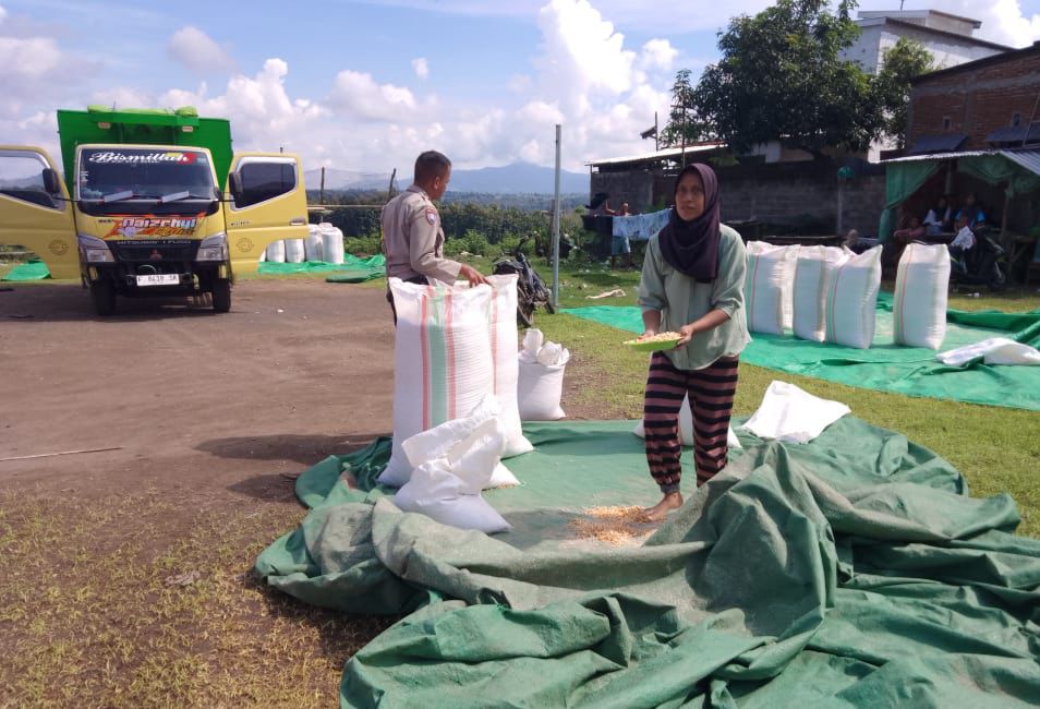 Dalam rangka mendukung program ketahanan pangan nasional, Bhabinkamtibmas Desa Katua Polsek Dompu melaksanakan kegiatan pemantauan hasil panen jagung milik warga binaan yang sedang dijemur dan sebagian telah di kemas untuk di salurkan ke gudang.