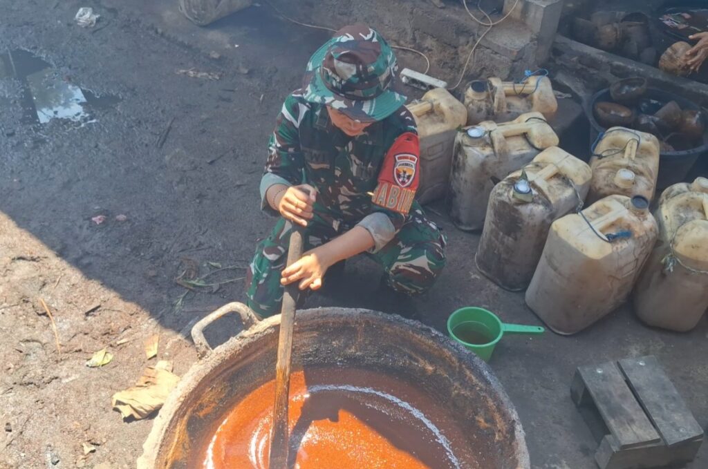 Babinsa Karang Bayan, Pelda (K) Ni Nyoman Dewi Tri Ary Susanti tampak menyambangi langsung para pengrajin yang sedang mengolah air nira menjadi gula aren. Dengan duduk bersama para pekerja di dekat tungku besar, ia berdialog santai sambil menyaksikan proses perebusan nira hingga mengental menjadi gula merah cair dan gula merah batok. Suasana sederhana itu menggambarkan eratnya hubungan antara aparat kewilayahan dan masyarakat binaannya.
