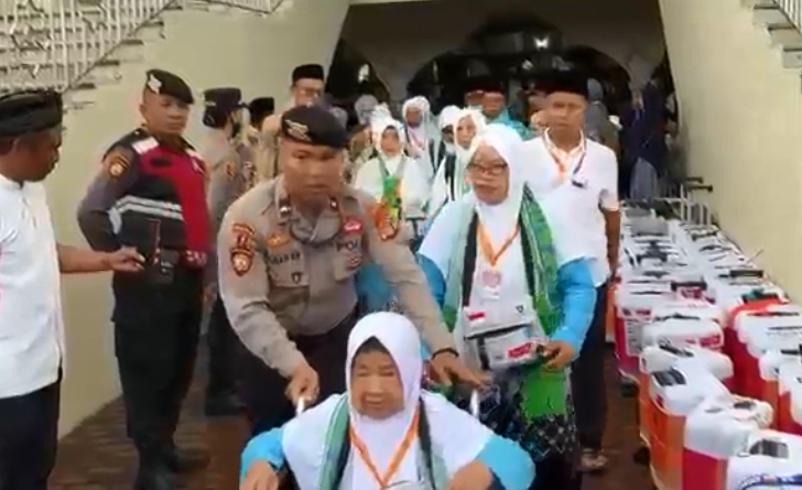 Petugas Kepolisian Dari Polres Lombok Timur Bantu Dorong Kursi Roda Calon Jamaah Haji